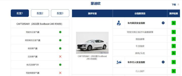 除了扎实的车身结构,蒙迪欧还配备了AEB主动刹车、车道偏离预警、前方碰撞预警、疲劳驾驶提醒、胎压显示、上坡辅助等丰富的主动安全功能。 在中保研 C-IASI 测评中蒙迪欧获得了“全 G 评级”:车内乘员安全指数(含驾驶员侧正面 25% 偏置碰撞、侧面碰撞、车顶强度等)、车外行人安全指数、车辆辅助安全指数三大核心项目均获“G(优秀)”评级。